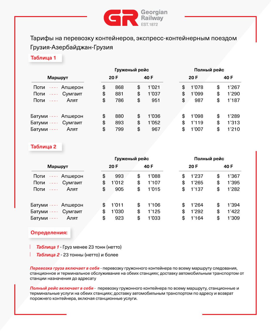 Тарифы блок-поезда, назначенного в рамках совместного соглашения железных дорог Грузии и Азербайджана, смотрите в таблице ниже: