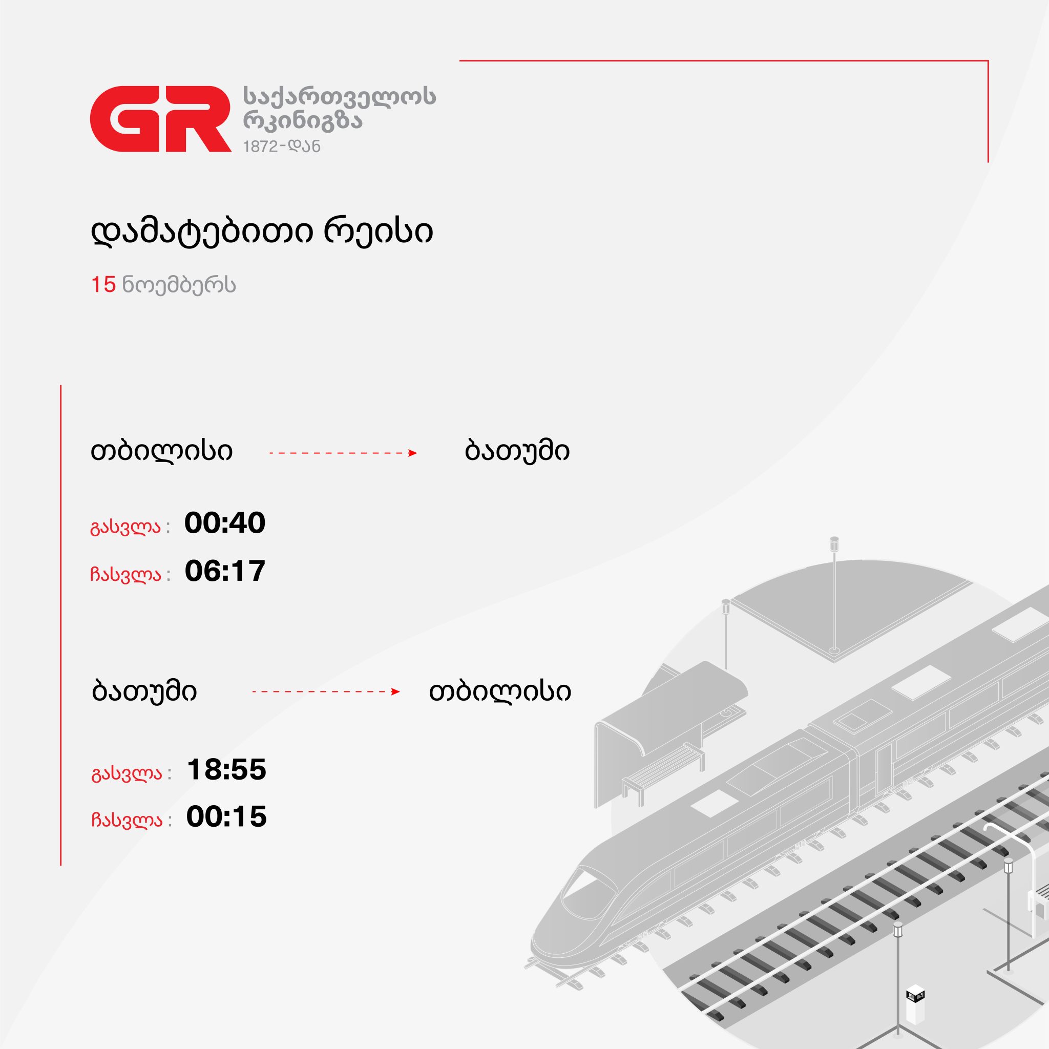 მგზავრების თხოვნის გათვალისწინებით, საქართველოს რკინიგზა, რაგბის თამაშზე დასწრების მსურველთათვის, 15 ნოემბერს თბილისი-ბათუმი-თბილისის მიმართულებით შტადლერის ტიპის მატარებლის რეისს ამატებს.