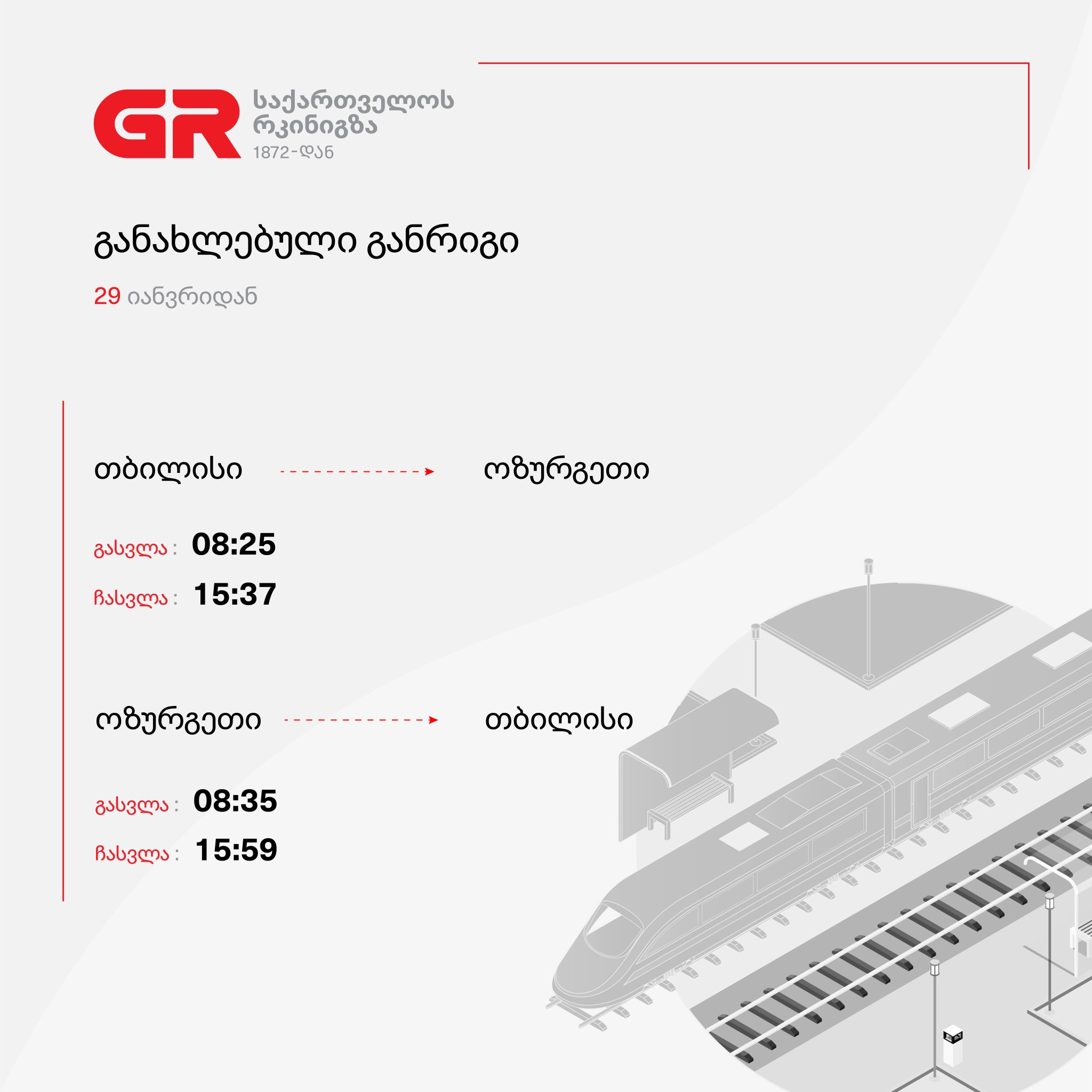 საქართველოს რკინიგზა 2026 წლის 29 იანვრიდან თბილისი-ოზურგეთი-თბილისის მიმართულებით მოძრავი მატარებლის განრიგს ცვლის. რეისები შესრულდება დღეგამოშვებით. განახლებული განრიგი იხილეთ ქვემოთ მოცემულ ცხრილში: